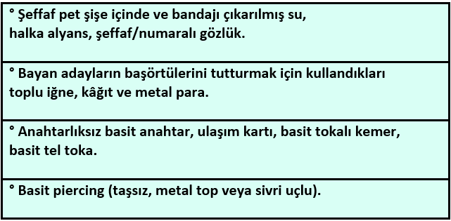Sınav binalarına aşağıdaki araç gereç ve eşyalarla girebilirsiniz.